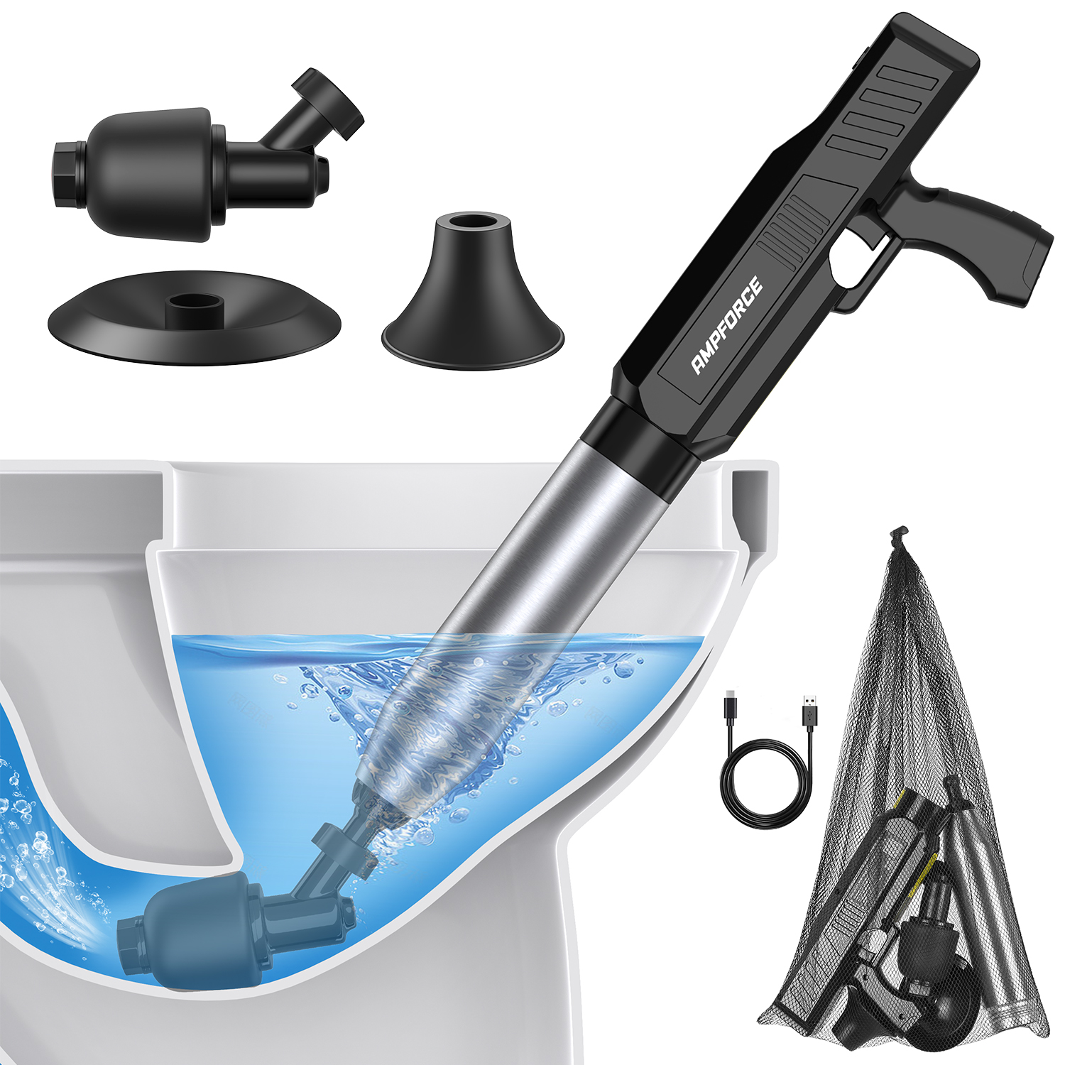 - [One-Stop Solution] Unlike traditional toilet unclogger that can only be used for unclogging toilets, AMPFORCE’s electric heavy duty blaster comes with multiple plunger heads, which means it can also be used for unclogging sinks, showers, kitchen drains, and pipelines.