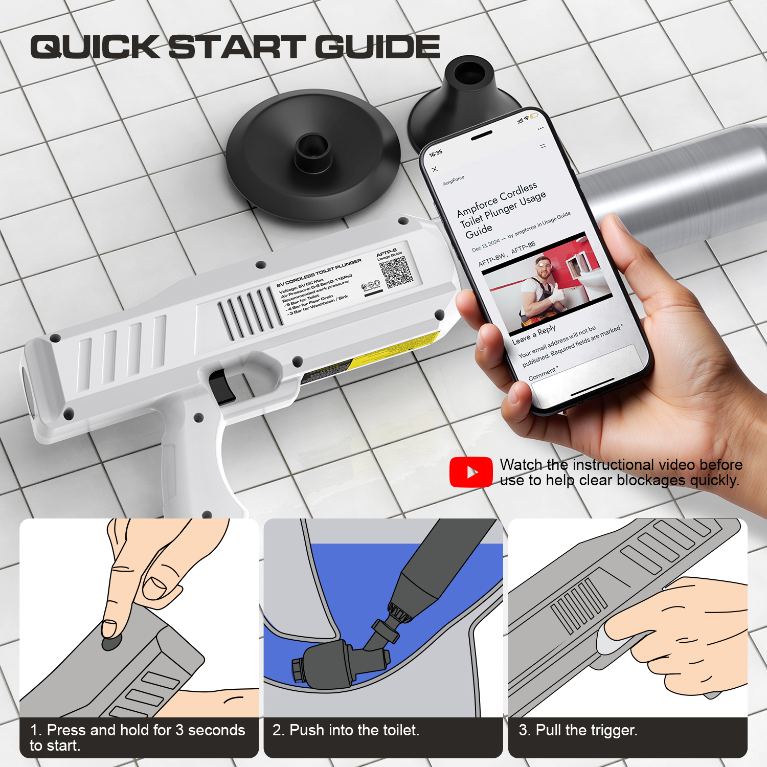 - [Easy to Clean] Still scrubbing grimy residue trapped in plunger crevices after using old-school toilet plunger? The AMPFORCE electric plunger for toilet skips the nasty cleanup—just rinse the plunger head under tap water, slide it into the free storage pouch, and boom! Spotless hygiene in 10 seconds flat!